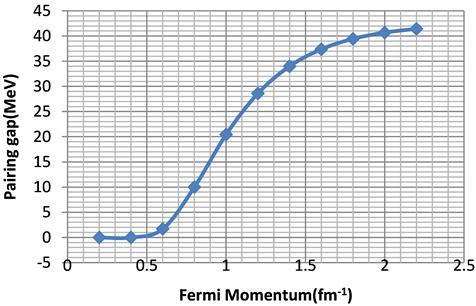 The energy gap increase steadily and faster for low Fermi momentum up to around 0.4 fm−1 and it is roughly constant with the value ≅1.0 MeV for . In literature the values of the energy gap are 0.2 MeV, 0.4 MeV, 0.6 MeV … for 0.2 fm−1, 0.3 fm−1, 0.4 fm−1 … respectively [15] which are in agreement with the known values. The reason for the good agreement in that, for calculating energy gaps the quantity that matters is the scattering length at energies of order of the Fermi momentum and this is strongly constrained by nucleon-nucleon scattering data for nucleon momentum in the