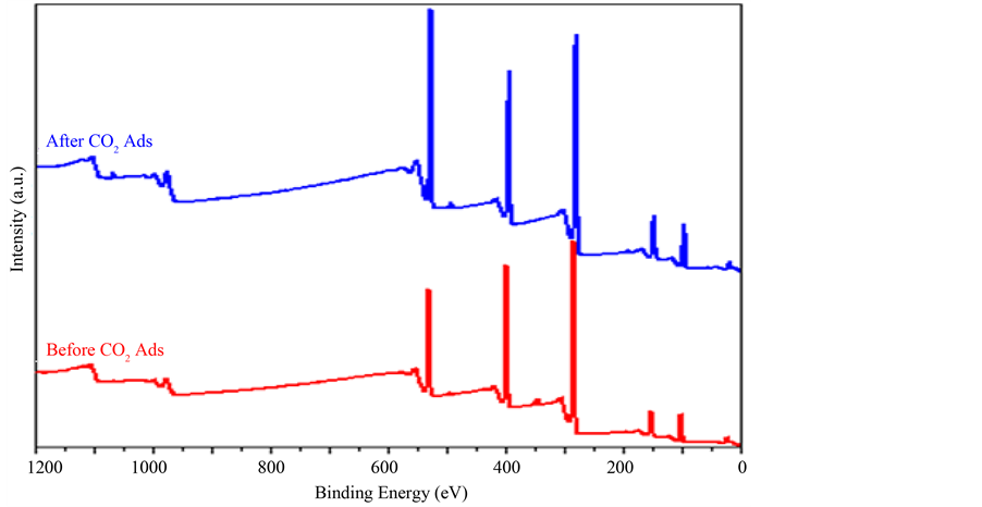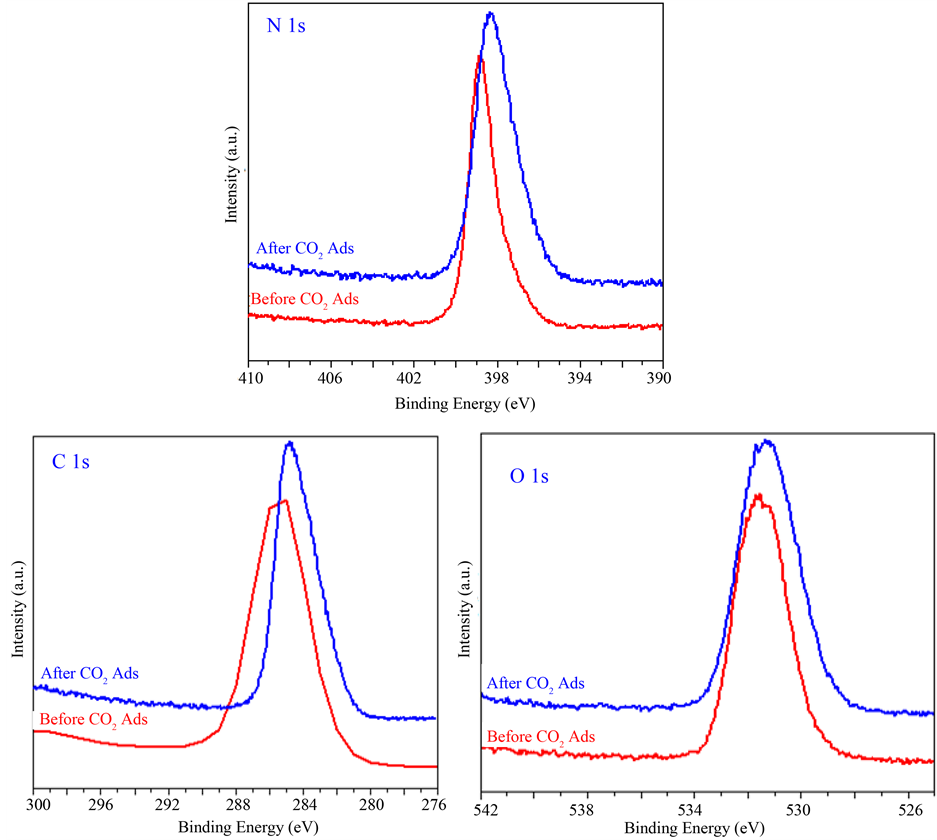 The C 1s spectra of the PEI/MPS occurred at 285.8 eV, which could be due to a combination of C-C and C-N boding. This binding energy value is a little bit higher than that of C-C single bond (which is typically at 285 eV). The high-energy value could be due to the conjugation nature of the C-C bond in the PEI-10k due to the neighbouring nitrogen atoms. When covered with CO2, the C 1s spectra was broad and its maximum intensity was shifted down to 284.8 eV. Lowering the C 1s binding energy after CO2 adsorption strongly supports the conjugation nature of the C-C bond in the PEI molecule as the nitrogen lone pairs were involved in the N-CO2 surface chemical bond at the expense of the conjugation of the C-C and C-N bonds. The shoulder at ~284 eV is possibly due to the N-CO2 surface chemical bonds.