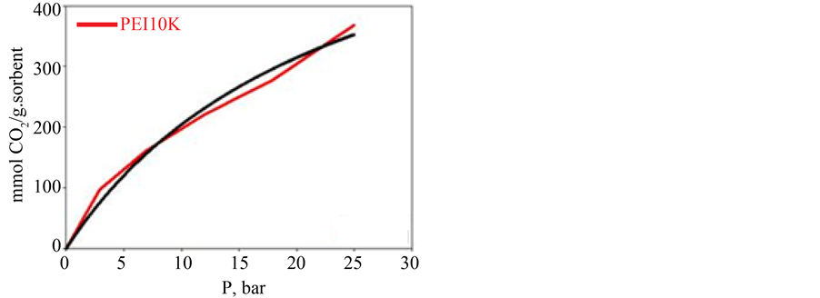 It is well-known that the gas pressure is a crucial factor for the sorption capacity of various sorbents. Hence, PEI10k/MPS was selected to investigate the effect of the CO2 pressure on the sorption capacity using TGA with pure CO2 gas at pressures ranging from 0 to 25 bar. Figure 8 shows CO2 adsorption isotherm obtained for PEI 10k/MPS. In this isotherm, the amount of CO2 adsorbed after reaching equilibration, expressed as mmol CO2/g of adsorbent, is plotted against gas pressure in bar. The CO2 sorption capacity became greater with increasing pressure. At 24.94 bars the capacity was 8.36 mmol CO2/g sorbent. This value is greater than the theoretical efficiency, which was previously calculated as 6.11 mmol CO2/g sorbent. An explanation for this increased efficiency could be due to chemisorbed CO2 in addition to the chemically formed carbamate. Raising the pressure favors chemisorption and can create new sites for CO2 capturing. The unreacted tertiary amine groups could be the active surface sites for the chemisorbed CO2. Every tertiary amine group could act as a possible site for chemisorbed adsorption. Therefore, about 4.07 mmole of CO2/g sorbent could still be adsorbed before reaching saturation.