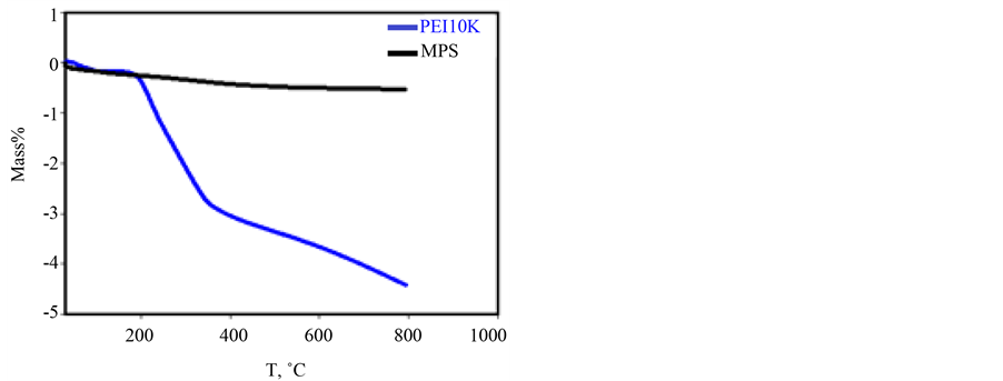 Figure 1. Thermogravimetric (TGA) graphs of PEI-10k/MPS and MPS. Mass loss either due to evaporation or decomposition of PEI-10k/MPS did not occur below 200˚C.