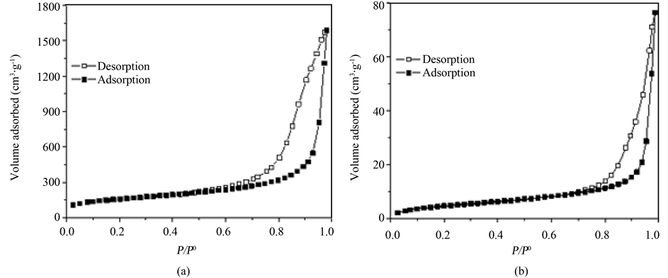 Figure 2. N2 adsorption-desorption isotherms at 77 K measured using Broekhoff-de Boer methodfor (a) MPS and (b) amine functionalized sample.
