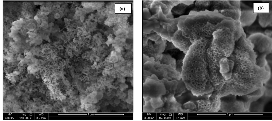 Figure 4. Scanning electron nanographs of (a) MPS and (b) PEI-10k/MPS.