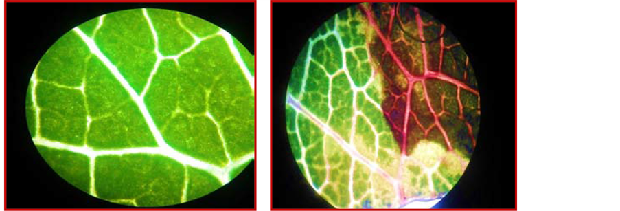 Figure 9. The picture under the microscope: (a) healthy leaf tissue and (b) diseased leaf tissue with the signs of fire blight.