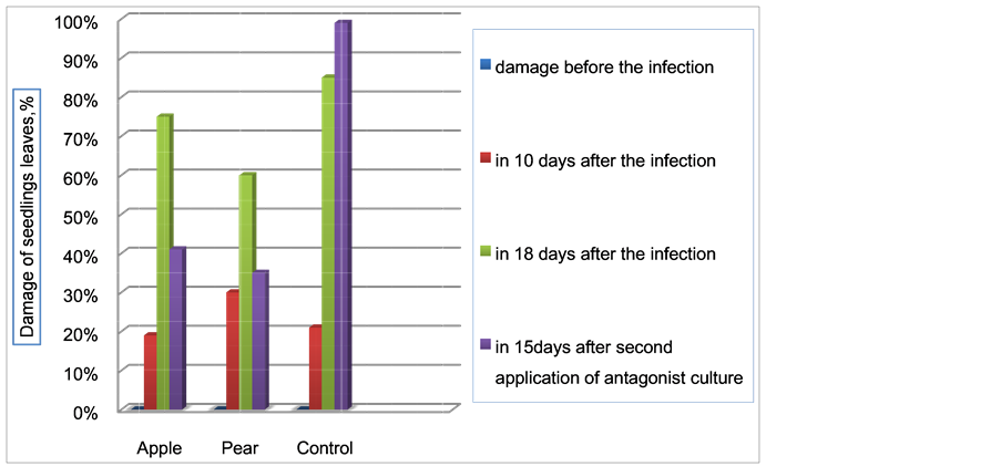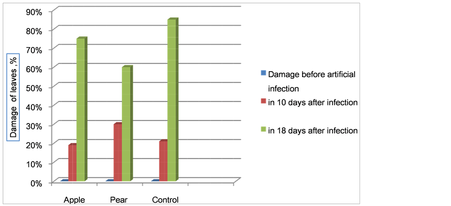 Within 10 days of artificial infection with E. amylovora, the number of healthy leaves decreased significantly; the percentage of damaged apple leaves was 28.0% - 29.2%, while pear leaves were at 55% - 56%. In the control group, the percentage of damaged leaves increased from 46% to 52% (Figure 10).