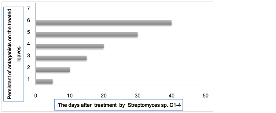 Figure 13. The shelf life of Streptomyces sp. C1-4 antagonist’s spores on leaf surfaces of seedlings, 40 days after the second treatment.