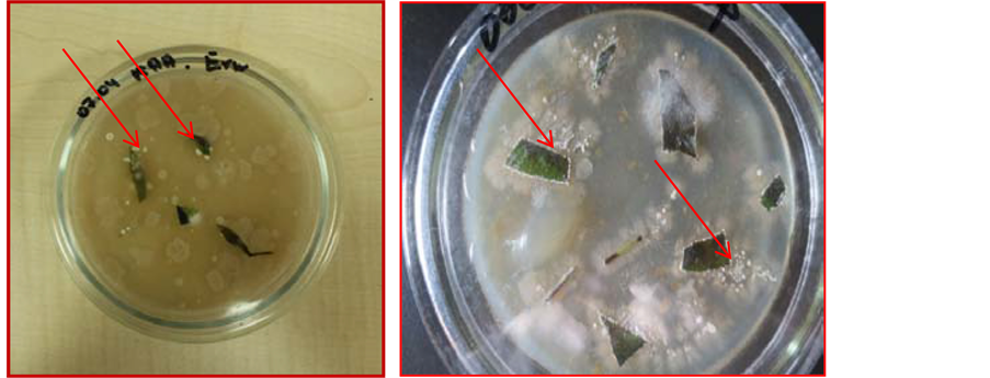 Figure 14. The leaf pieces taken from seedlings are shown by red arrows, overgrown by colonies of Streptomyces sp. C1-4 on this medium.