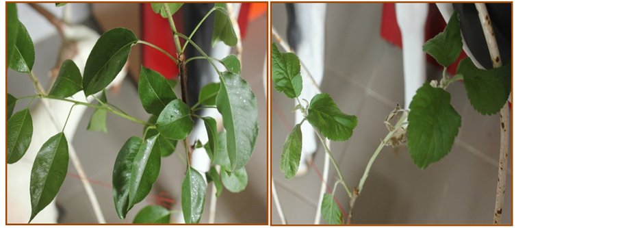 Figure 15. (a) Recovering leaves of pear seedlings and (b) recovering leaves of apple seedlings 40 days after second treatment.