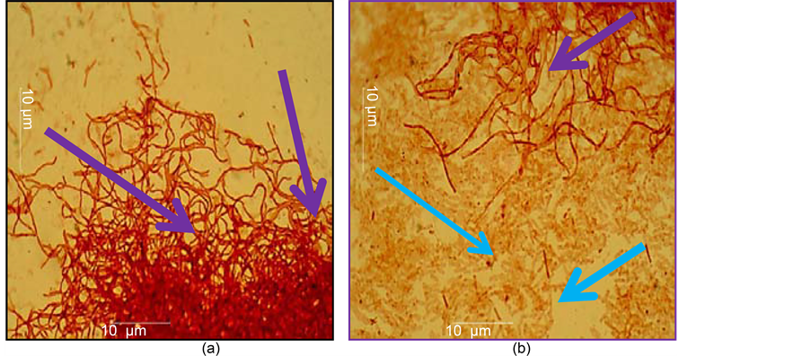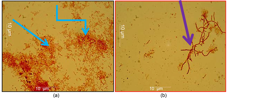 In the liquid medium, Streptomyces SK-6, 6 bambargiensis strain showed a high activity against Erwinia amylovora. Phytopathogen cells were completely lysed by the enzymes of the antagonist; in the micro pictures only mycelia and hyphae of Streptomyces (purple arrows) were visible and there were no phytopathogens cells (Figure 6(a)). The Streptomyces fumanus gn-2 strain’s activity was weak, as phytopathogen cells multiplied rapidly in the presence of antagonists (blue arrows) (Figure 6(b)).