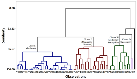 Cluster analysis forms different groups or clusters on the basis of similar response of lines/varieties but it does not necessarily mean that all entries in a group have same response or origin. However, this analysis provides helpful insight that could be used in the development of resistant varieties. Clusters can identify sources of new resistance along with high yield factor to overcome the altering pathogen and environment, and also study the mechanism of resistance.