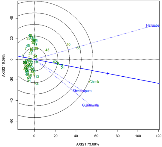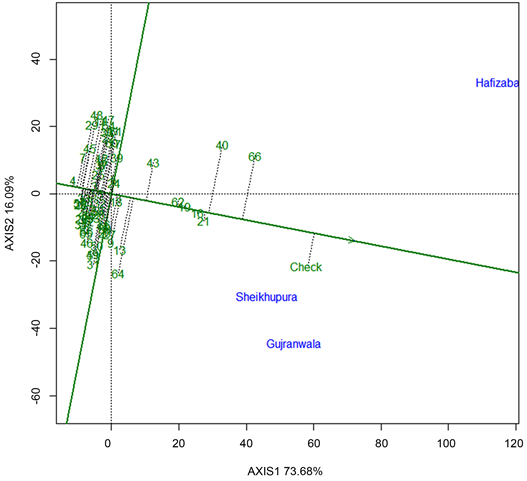 The figure further emphasizes the performance of each genotype in different locations. Genotypes can be further divided into group according to their locations in GEI biplot. The biplot can be seen divided into four parts (Figure 2) by two axis, vertical mean axis and horizontal mean axis. The genotypes near the horizontal mean axis (HMA) are more stable as compared to those genotypes which are far from the HMA. Keeping in view the whole scenario, it can be depicted that performance of the genotype entry no 64 was the least stable, followed by entry no 64, 40 and 66 as indicated by their distance from HMA in the GEI biplot.