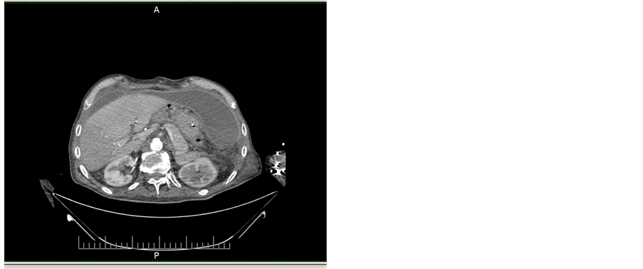 The patient returned to our ward in the 28th POD, breathing spontaneously, with normal diuresis but still febrile. Within a few hours since the admission an abundant, purulent like discharge started to flow from the colostomy edges with characters very similar to enteric fluid. A new CT scan revealed two large purulent communicating collections in the right and left paracolic gutters (Figure 6): in spite of percutaneous CT guided drainage, pus evacuation was not satisfactory. Such condition, together with the suspicion of an enteric leakage brought to a new laparotomy: no enteric leakage was found, the two collections were evacuated and after peritoneal toilet three new drainages were left in the abdominal cavity. During the second postoperative course the patient underwent further respiratory distress, recurrent renal failure and required two new blood trans- fusions. The patient died while asleep in the 5th POD (34 days after the primary operation). Autopsy was not performed.
