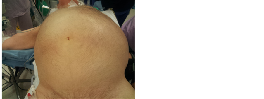 Figure 1. Patient on the operation table: clinical appearance of the huge abdominal distension.