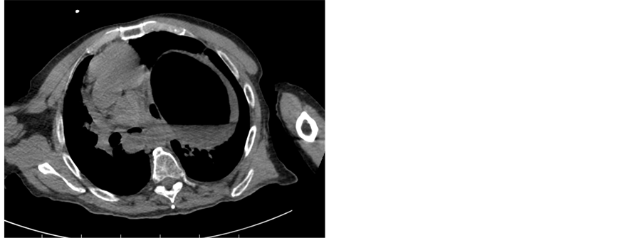 Figure 3. Upper CT scan showing the sigmoid colon reaching the level of tracheal bifurcation and mediastinum moved to the right.