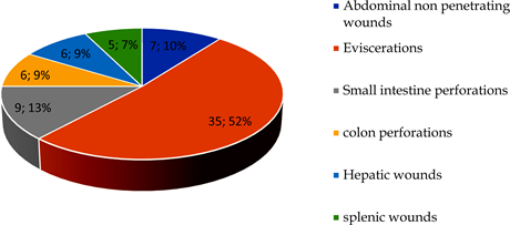 count, serum creatinine, and blood glucose was performed in all patients. A complete clinical examination was then performed. This examination made it possible to retain the diagnosis of non-penetrating wound in 7 cases (ie 10.3%). The remaining 61 cases (89.7%), were abdominal penetrating wounds and then, an examination was performed in the operation room under anesthesia. Thirty- five patients (51.5%) had an evisceration with externalization of the small intestine or omentum, without intra-abdominal organ injury (Figure 2).