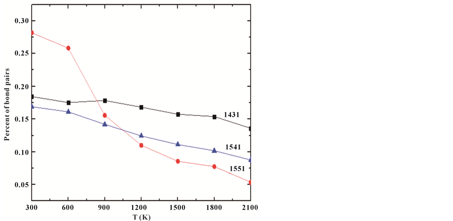 8.5%, 13% at the temperature of 2100 K, respectively. For the 1551 pairs, the fraction increased from 5% to 27.5% with temperature rapidly decreasing from 2100 K to 300 K. The fraction of 1551 pairs, a modest figure, with the temperature of decreasing from 2100 K to 900 K; however, it was booming growth to 27.5% when the temperature of decreasing from 900 K to 300 K because the system have started to transform to amorphous at 900 K. The fraction of 1431 pair did not change much, while increasing from 13% to 15.7% in the whole temperature range; the fraction of 1541 pairs is 14.6% at 300 K.