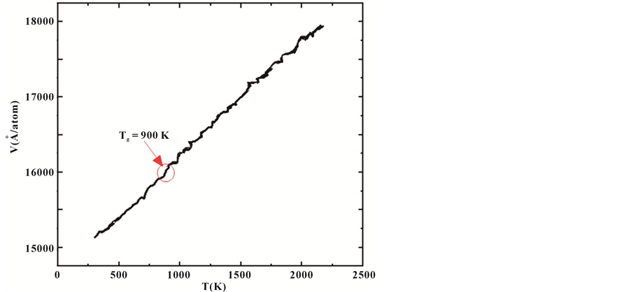 As is known that the Liquid transform to crystalline state is a first order phase transformation; it is typical of the System volume will be sudden changes in the crystalline temperature. Figure 1 represents the variation of average volume of per atom as a function of temperature during the heating and cooling processes with the cooling rate of 5 × 1012 K/s. As shown in Figure 1, there is an obvious jump in the volume versus temperature curve (black curve) near the 900 K With the rapid decrease of temperature. in the cooling process, it is found that the liquid-crystal is not transform to amorphous state with temperature decreasing form 2300 K to 1000 K if the the system volume will not be Sudden changes; however, representing the typical character of a liquid-glass transition is the system volume Sudden changes at the temperature region near Tg, one can yield a crossover at which the Tg was determined to be 900 K. In other words, the system of Al30Co10 liquid alloy will be transform to amorphous with the Tg = 900K.