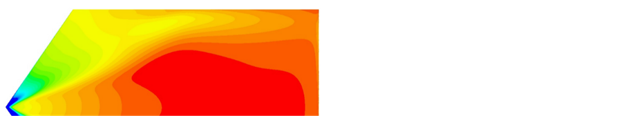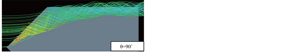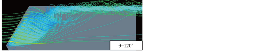 Cp coefficients show how the pressure on the wing behaves, compared with the pressure in the uniform fluid flow. It, therefore, follows that if Cp has negative value, the pressure on the wing surface is lower than that in the uniform flows. The characteristics of the longitudinal vortex are well reflected by pressure coefficients on the wing surface. The fast flows close to the wing tip are rapidly separated, but the rotational radius is small. Since the centrifugal force has the property that it is proportional to the square of the velocity and is in inverse proportion to the rotational radius, this causes the tip of the longitudinal vortex to induce the largest negative pressure. As a result, the wing tip has the lowest pressure coefficients in dark green color for θ = 90 and 110 degrees as shown in Figure 7(b). The pressures in the longitudinal vortex gradually tend to recover due to the diffusion of the vorticity and convection of flows. The characteristics of equi-contour lines of pressure coefficients agree well with the experimental results of actual vehicle by Ogawa [13] [14] especially for θ = 90 degrees. During the state of the longitudinal vortex system, the particles in the system will be accelerated until the velocities of the particles are faster than mean flow velocity. This makes pressure on the wing surface lower than that in the mean flow, and much lower than that in the mean flow particularly for θ = 90 degrees.