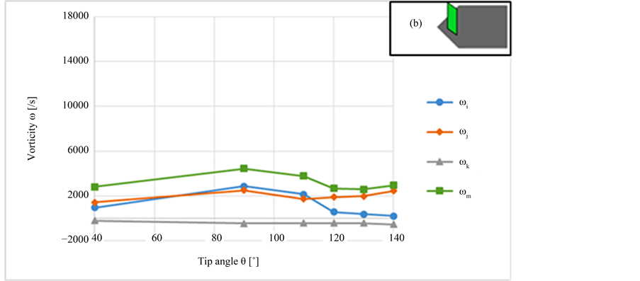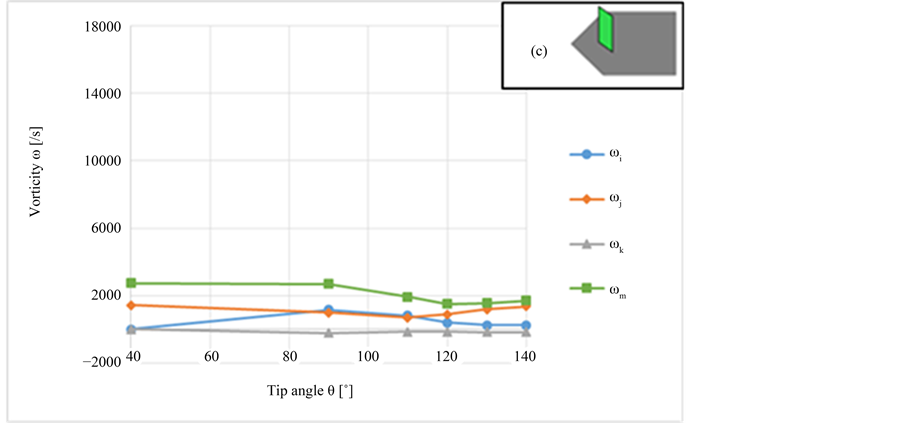 Figure 8 shows the relationship between vorticity and tip angles in each section of A, B, and C for the tip angles of the wings 40, 90, 110, 120, 130, and 140 degrees. Of the three sections, the section A near the tip angle has by far the strongest vorticity in terms of magnitude of vorticity
