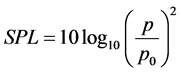 Aerodynamic sound measured in the far field is defined as Sound Pressure Level; SPL (dB) in Equation (9), where p is RMS of sound pressure measured 1.5 m away from the delta wing by the microphone, and p0 is