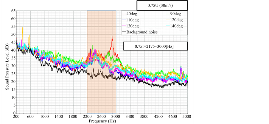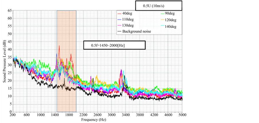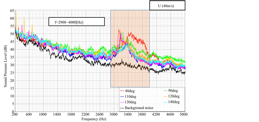 In the study, frequency band f was chosen as standard values of f = 2900 - 4000 Hz at U = 40 m/s. Since the frequency of shedding vortices is proportional to the airflow velocity in accordance with Equation (10), frequency bands are set as 0.25f = 725 - 1000 Hz at 0.25U = 10 m/s, 0.5f = 1450 - 2000 Hz at 0.5U = 20 m/s, and 0.75f = 2175 - 3000 Hz at 075U = 30 m/s. These chosen frequency bands are depicted in red-colored zone in Figure 11. Since the red-colored zone covers the prominent frequency band at the respective airflow velocity, it follows that measurements of aerodynamic sound are quite reasonable. With respect to aerodynamic sound obtained by FFT analyses, it is found that aerodynamic sound for the longitudinal vortex system with both red- colored line of θ = 40 degrees and green-colored line of θ = 90 degrees are larger than that for the transverse vortex system with other four colored lines.