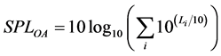 Next step is to investigate the dependence of both aerodynamic sound produced by the longitudinal and the transverse vortex system on the airflow velocity. Aerodynamic sound is evaluated in the form of overall values SPLOA given by summing up sound pressure level Li of the frequency band in the red-colored zone for the respective airflow velocity, based on Equation (11).