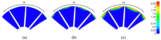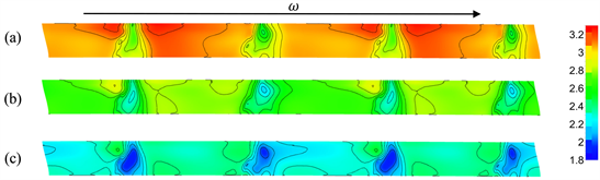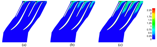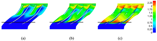 Figure 10. Pressure ratio at rotor exit for 0.2 mm (a), 0.6 mm (b) and 1 mm (c) tip gap height.