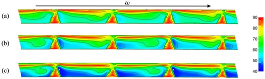 Figure 12 shows the colour contours of the absolute flow angle for the three simulated conditions. Considering that the absolute flow angle design value is equal to about 68˚, it can be noticed that for the smallest tip gap height this value is respected within the bladed channel.