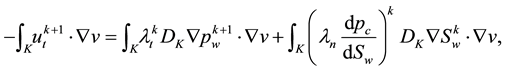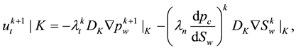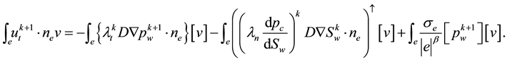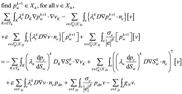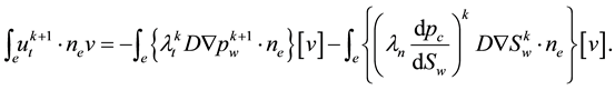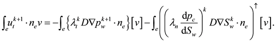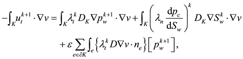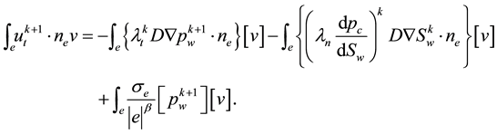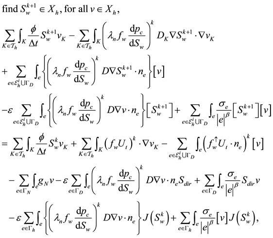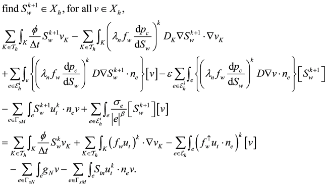 The spatial discretization of the saturation equation is similar to that of the pressure equation given in (28). The diffusion term of the saturation equation is discretized by the PDG methods, and the advective term is discretized by a traditional DG method with using the upwind scheme. An Euler scheme in time is used. The saturation Equation (2) equipped with Mixed-Neumann boundary conditions (8)-(11) could be written as:
