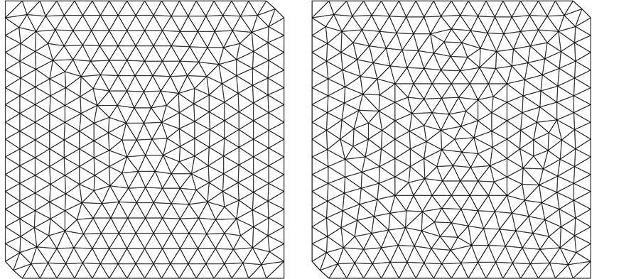 Figure 2. Meshes used in the experiments. (a) quarter-five spot mesh used in homogeneous medium; (b) quarter- five spot mesh used in discontinuous media.