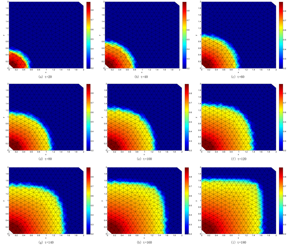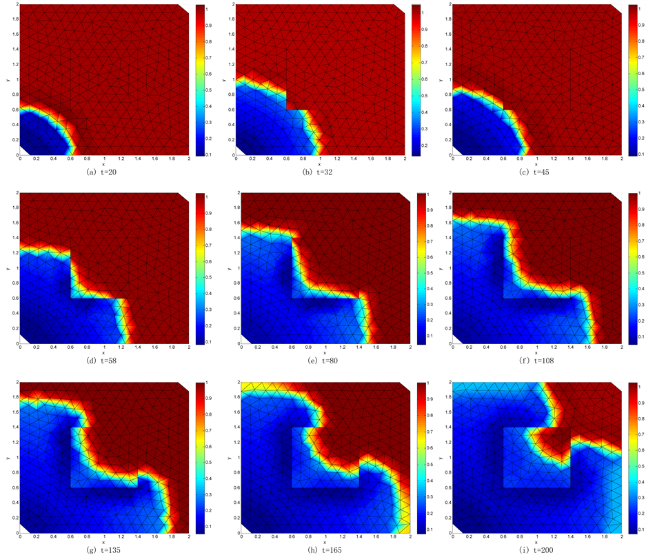 the reversed direction the oil immediately penetrate the interface, that is, the oil-trapped phenomenon will not happen if the oil flows from fine sand to coarse sand. The contours of wetting phase saturation in the discontinuous media at selected times are presented in Figure 5.