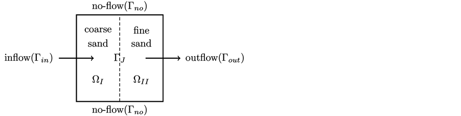 In the last test, we examine our scheme in a discontinuous media. We assume that the domain used here is initially fully water saturated and with the interfaces between two different sands, see Figure 4.
