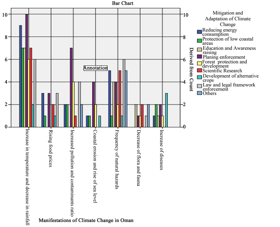 Figure 3 indicates that climate change impacts of the Sultanate of Oman are evident in several manifestations. 36% of the sample believed that rainfall fluctuation is the most obvious sign of climate change. While 22% indicated that the most apparent is indicator is natural disasters. Oman being a coastal region has put the country close to risk associated with climate change like (tropical cyclones). Respondents believe that Oman was one of the most stable countries in terms of natural disasters for years, but recently with the last eight years the country has encountered two cyclones the most disastrous was gone in 2007 which had caused human and property physical losses and the second was Cyclone Phet in 2010, but the latter was less dangerous and damaging. The 14.67% pointed out that pollution is the most prominent effects of climate change, where the air and water pollution rate has increased in some areas, especially the coastal Batinah coastal line. Due to the relationship between pollution and diseases, 6.67% of the sample considered that the most prominent effect is the spread of diseases due to the change in temperature and pollution. Health records have revealed the spread of fever diseases and tuberculosis, where the proportion of tuberculosis has increased recently due to moisture and air pollution. The rest of sample which is 8.67% considered the most likely apparent features of climate change are economic stresses and rising food prices.