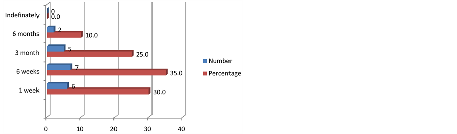 There was a fairly even distribution of prescribing duration with 6 (30.0%), 7 (35.0%) and 5 (25.0%) respondents prescribing prophylactic AEDs for 1 week, 6 weeks and 3 months, respectively (Figure 5). Only 2 (10.0%) individuals prescribed for 6 months. No one prescribed prophylactic AEDs indefinitely. Three prescribers did not respond to this question.