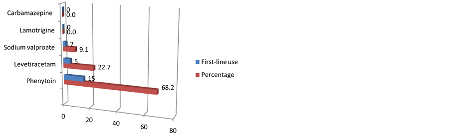 Figure 4. Bar chart demonstrating the distribution of first-line prophylactic AEDs prescribed in patients with a newly diag- nosed intrinsic brain tumour.