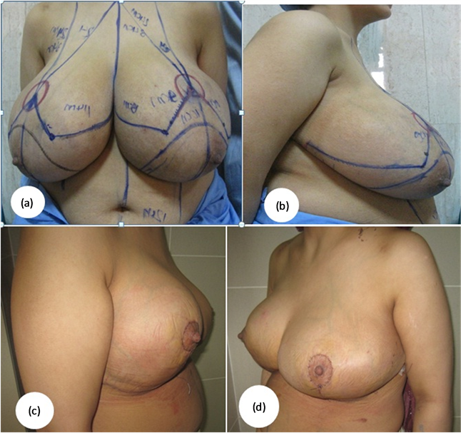 Figure 1. A 37-year-old patient, subjected to reduction mamaplasty using the inferior pyra- midal technique. (a) Preoperative marking; (b) Right lateral view; (c) Early post operative rtight lateral view; (d) The same patient early post operative left lateral view.