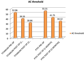 Table 3. Comparison of AC threshold post op 1 month & 3 months between PTFE and Titanium.