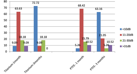 Figure 3. ABG results in number of ears operated at 1 and 3 months post op with Titanium prosthesis and PTFE prosthesis (Wehr’s classification).