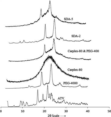 Figure 3. Powder X-ray diffraction patterns of ATV, PEG-4000, Carplex-80, PEG-4000 + Carplex-80, SDA-2 and SDA-5.