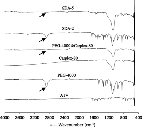 Thermo-grams of ATV, PEG-4000, Carplex-80, PEG-4000 + Carplex-80 and the SDA were obtained from DSC (Exstar SII DSC7020, Hitachi High-Tech Science Corporation, Tokyo, Japan). Each sample (3 - 5 mg) were placed in sealed standard aluminum pans and heated from 0˚C to 296˚C, at a scanning rate of 10˚C/min, under nitrogen purge, with an empty aluminum pan as reference.