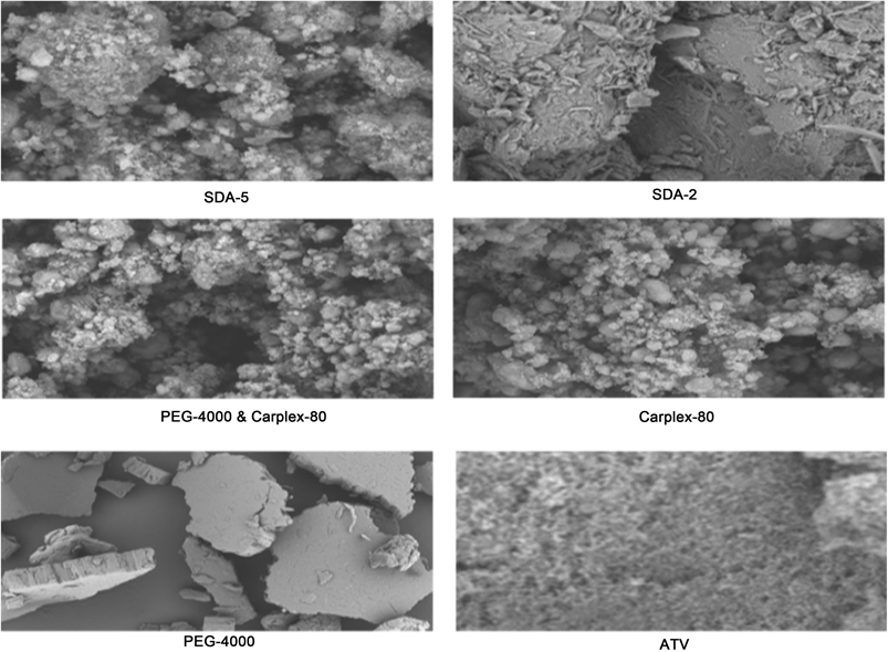 The SEM photographs of pure ATV, PEG-4000, Carplex-80, mixture of PEG-4000 and Carplex-80 (2:3) and optimized SDA formulations are shown in Figure 5. Upon preparation of SD a distinct conversion of crystalline ATV to amorphous state was explored with morphology of SDA formulation. Also, there were a