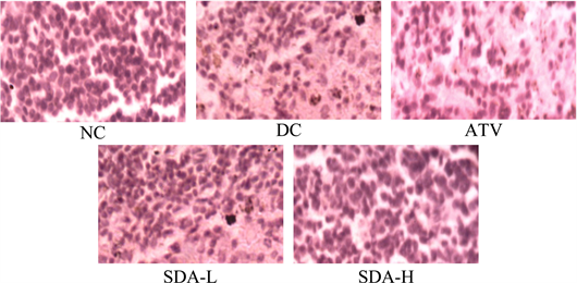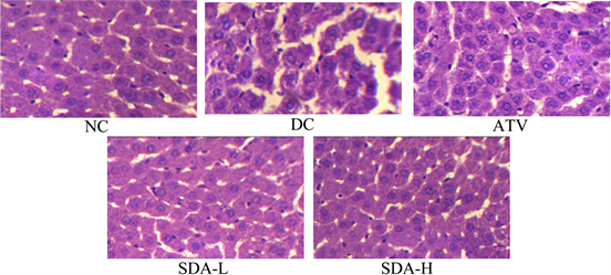 Figure 6. Effects of ATV and SDA on liver. Hematoxylin and eosin staining of the cross sectional tissue slices of liver depicting lipid deposition in the liver of STZ induced diabetic mice. Original magnifications 400×. Group NC, age-matched normal mice treated with vehicle; Group DC, diabetic mice treated with vehicle; Group ATV, diabetic mice treated with ATV (10 mg/kg/day); Group SDA-L, diabetic mice treated with low dose of SDA (equivalent to 1 mg/kg ATV/day); Group SDA-H, diabetic mice treated with high dose of SDA (equivalent to 10 mg/kg ATV/day).