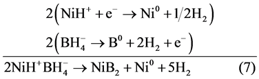 This value shows the thermodynamic feasibility of the proposed mechanism. Different stoichiometry of nickel borides can be calculated using the same methodology. Chemical reactions that help explain the formation of metallic nickel and NiB2 are summarized in Scheme 1 and Scheme 2.