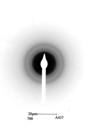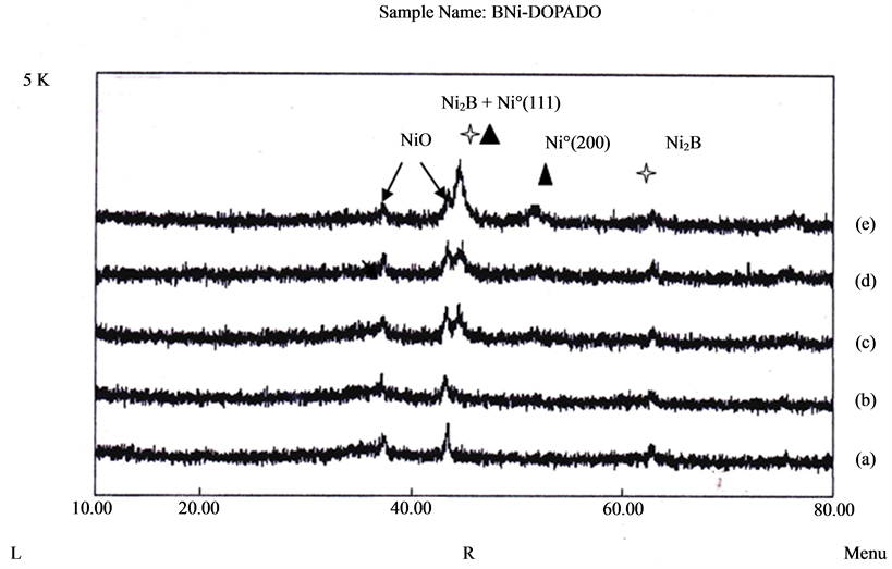 X-Ray Diffraction studies performed on doped and non-doped nickel borides show amorphous structures in all cases. Only one broad peak around 2θ = 45˚ was observed for the fresh sample indicating a typical amorphous character [13] . The nickel boride profile is consistent with the structure of mixtures of Ni2B and Ni, according to Kapfenberger et al. [14] . To study where phases are present in amorphous alloy is necessary to anneal solids.
