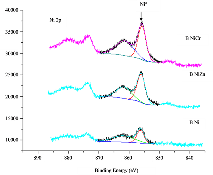 For the fresh sample (not annealed), almost all the nickel species were present in the metallic state, corresponding to the binding energy of 856.4 eV in Ni 2p3/2 level, as can be seen in Figure 4. The boron species were present in both the alloying state with Ni and the oxidized state corresponding to BE of 188.3 and 192.2 eV, respectively. Since the BE of alloying B was nearly 1.0 eV higher than that of the standard pure B 187.1 eV [15] , one can conclude that partial electron transfer occurred from B to Ni in Ni-B amorphous alloy, making Ni electron-enriched, although no significant change in the BE of the metallic Ni alloying with B was observed, due to the much larger size of the Ni atom in comparison with that of B atom. In doped and non-doped nickel borides the signal corresponding to Ni-B binding energy was lower than B2O3 signal. It is well known that slightly exposure of nickel boride to the atmosphere produces significant oxidation to the active surface. In consequence B2O3 signal became higher. However when Cr was used as dopant metal the BENi-B was higher than when Zn was used as dopant.