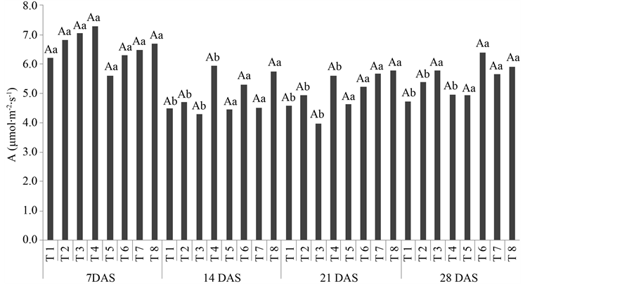 In the first week of the experiment, when there were no significant differences in photosynthetic rates (Figure 1), the temperature was approximately 29.5˚C. Temperature values were constant until 21 DAS, reaching approximately 32.5˚C at 28 DAS. Vapor deficit pressure (VDP) remained constant until 14 DAS, decreasing until 28 DAS. After 14 DAS photosynthetic rates remained constant in plants submitted to the treatments 5, 6, 7, and 8, but decreased in treatments 1, 2, 3, and 4. These results suggest that the most efficient formulations for main- taining photosynthesis in coffee seedlings under variable temperatures were composed of phosphite formulations. Phosphite application in high rates was related to the increase in leaf aerea index and reduction of infestation in soybean plants infected by downy mildew [24] .