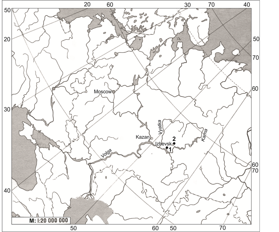 Typha shuttleworthii W.D.J. Koch et Sond. relates to species of typical section of genus Typha L. (Typhaceae Juss.) [1] [2] . The modern areal of species embraces the ocean districts of Europe and includes the countries of the Medium and Central Europe and Mediterranean, quasi―the countries of Eastern Europe [2] [3] . Almost everywhere species is considered rare. It is extinct in Hungary, included in the Red Data Books or Red Lists in many European countries: Slovakia, Liechtenstein, Germany, Switzerland, Austria, Greece, Bulgaria, Czech Republic, Serbia [3] -[8] . This species was recently marked in Poland, where it is considered as a vulnerable plant species [8] . At the same time, in European Red List of Vascular Plants needed protection, it is marked as a species for which there is no sufficient information (“Data Deficient”) [9] . The species is known also from Belarus [10] ; it is given to Ukrainian steppe flora [11] . In Russia T. shuttleworthii is considered sufficiently common species in some Western regions and is known from Moscow and Kaluga regions, from Krasnodar Territory, Crimea and some areas of Ciscaucasia [11] -[13] . The extreme eastern populations in area of T. shuttleworthii are known from the territory of Vyatka-Kama Cis-Urals (VKCU) within the Republic of Udmurtia and Tatarstan, where the growing of this cattail for the first time was marked by us in 2006 [14] [15] . Afterwards a small population of the species was found in the city Izhevsk [16] . In connection with the feature of distribution of T. shuttleworthii and its rarity, it is interesting to study some biological and ecological characteristics of plants of this species growing on the border of the area.