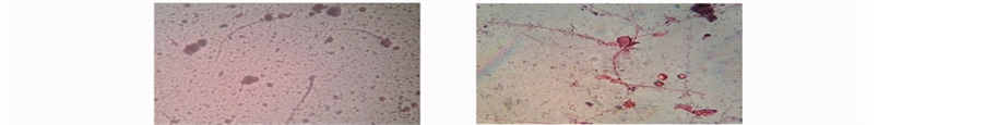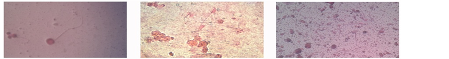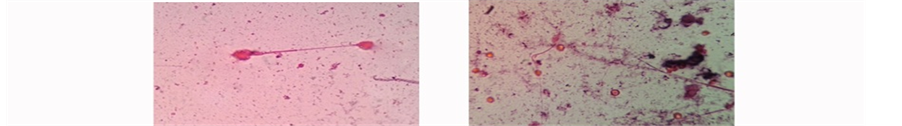 Sperm abnormality: Testis were macerated with two forceps to get cell suspension.10 ul of the cell suspension were taken by micropipette on a slide, a drop of eosin necrosin was added to the 10 ul cell suspension and mixed well and air dried, then observed under medium power in thelight microscope [11] .