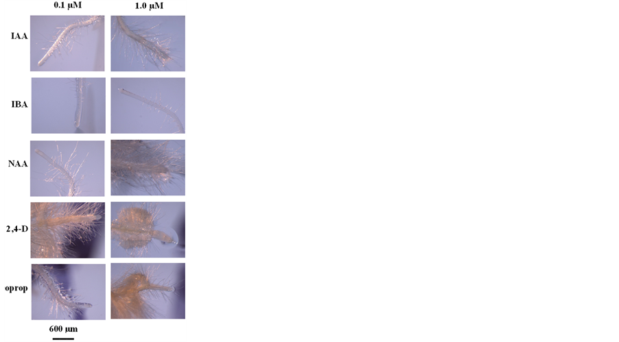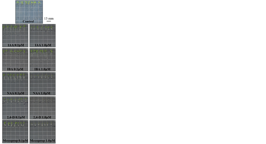 The chemical structures of auxinic compounds studied show structural relationships of the five compounds used in this study (Figure 1). These auxinic compounds caused differential growth effects on A. thaliana seedling roots when exposed to two concentrations of each compound under continuous light for 96 h as depicted photo-
