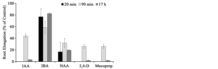 Studies using short-time exposure of auxinic compounds on A. thaliana root elongation indicated rapid effects caused by some treatments (Figure 6). When compounds were applied (a 10 µL drop, 1.0 µM) to the root tip, no growth occurred by 20 min in the IAA, 2,4-D and mecoprop treatments. Some elongation occurred at 90 min, but little growth occurred during the 90 min to 17 h period in the IAA, 2,4-D and mecoprop treatments.