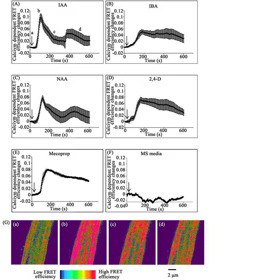 Calcium signatures elicited by these auxinic compounds were obtained using FRET imaging of the YC3.60 cameleon that detects fluxes of cytosolic calcium levels in Arabidopsis root tips (Figure 7). NAA-and IAA- treated root tips exhibited distinct biphasic fluxes of cytosolic calcium during a 10 min recording period. Mecoprop, 2,4-D and IBA exhibited rapid initial elevation of cytosolic calcium, followed by a slow decay of signal over time. The maximal FRET efficiency in each of the signatures varied for each compound. Glutamic acid, a known elicitor of cytosolic calcium fluxes in plants [30] was utilized as a standard to verify system accuracy (data not shown). We also used MS media alone as a negative control to confirm a lack of touch-induced calcium fluctuations (Figure 7(F)).